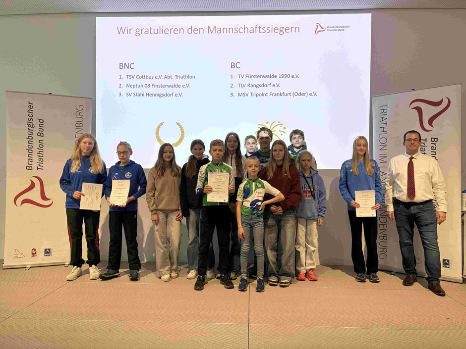 Der Vorstand des Brandenburgischen Triathlon Bund (BTB), vertreten durch Ivo Köster und Bernd Grotz, lud am heutigen Sonntag zur Ehrung der Sieger:innen und Platzierten des Brandenburgischen Nachwuchscups (BNC) sowie des Brandenburg Cups (BC) 2025 an den Olympiastützpunkt nach Potsdam ein. Rund 40 Athlet:innen aus den Mitgliedsvereinen des BTB e.V. folgten der Einladung.